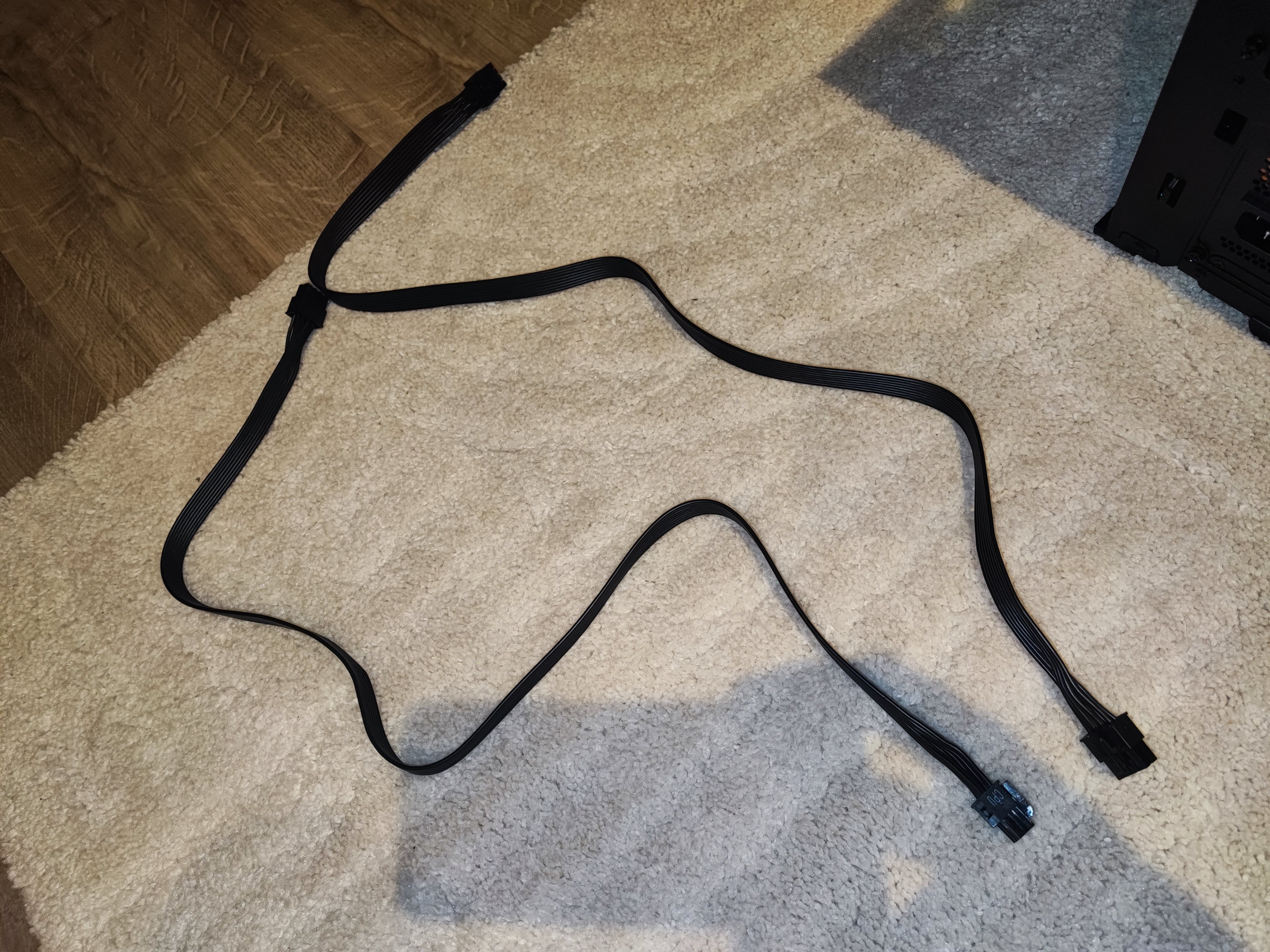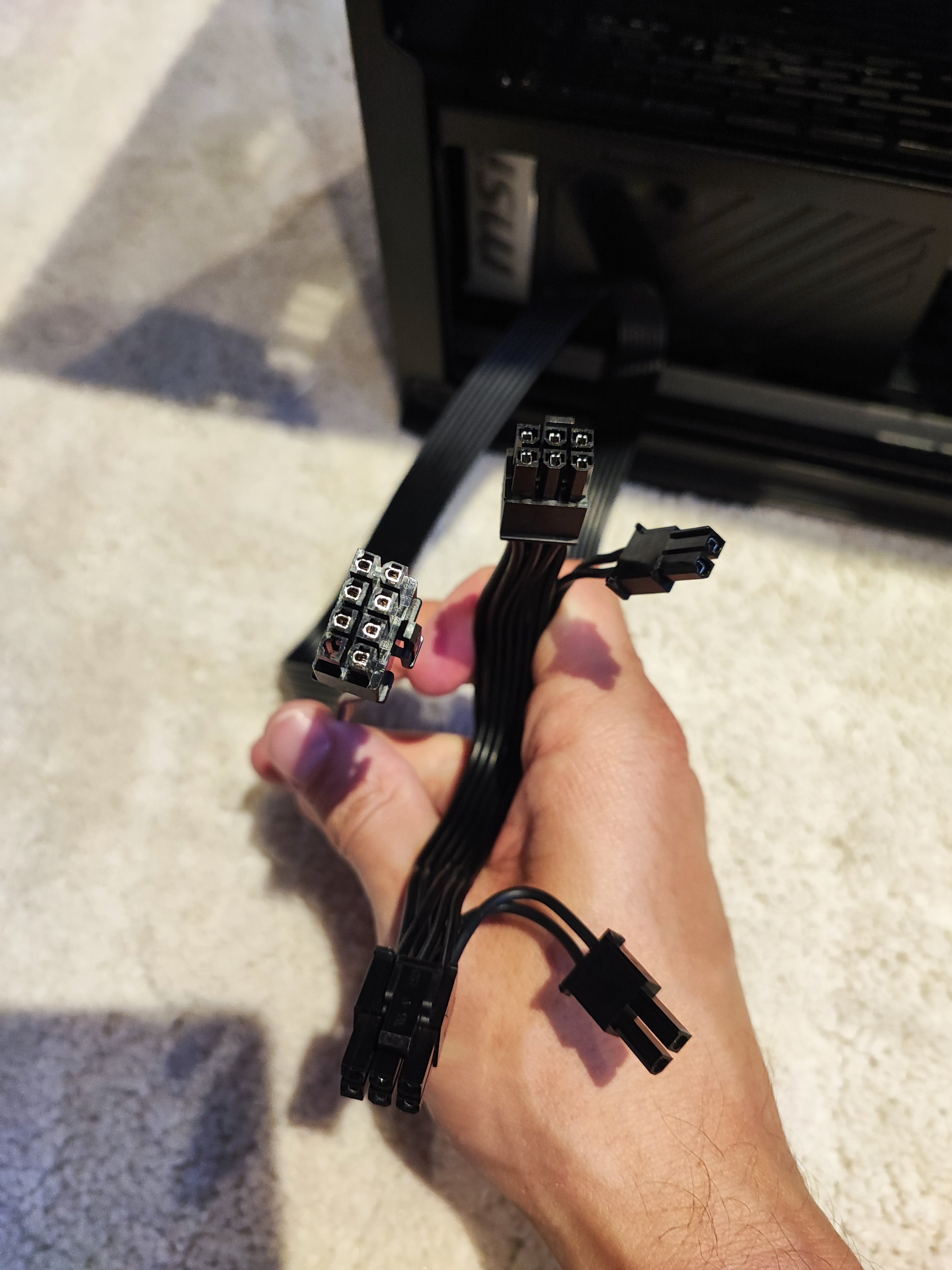 Grafikkarte <> Netzteil <> 12V2x6 Kabel verbunden auf einen Zwillingstecker zur Grafikkarte.