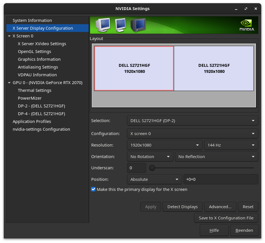 Mit Gnome kenn ich mich zu wenig aus, aber unter KDE geht das unter System-settings, siehe Screenshot. Da brauch ich die nvidia-settings nicht.zelect0r schrieb:Zu viel gefriemel für ein Spiel, wenn es danach wenigstens genauso laufen würde wie unter Windows, aber so, NEIN!