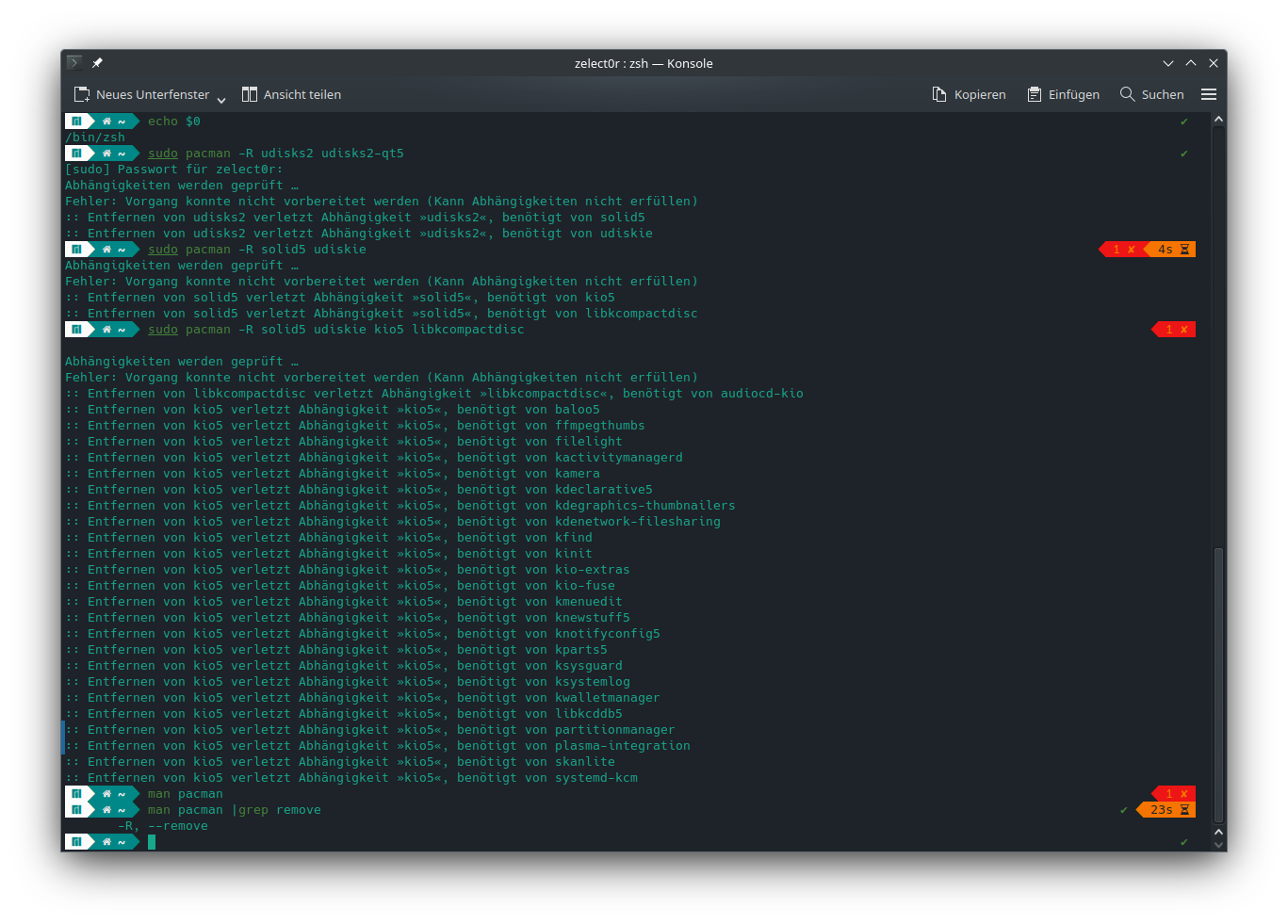 Ich habe eben testweise zwei Pakete installiert und möchte die nun mit "pacman -R pkg" wieder los werden, nur stehen die sofort in Abhängkeit gegenüber anderen Paketen und ich kann diese nicht mehr deinstallieren.