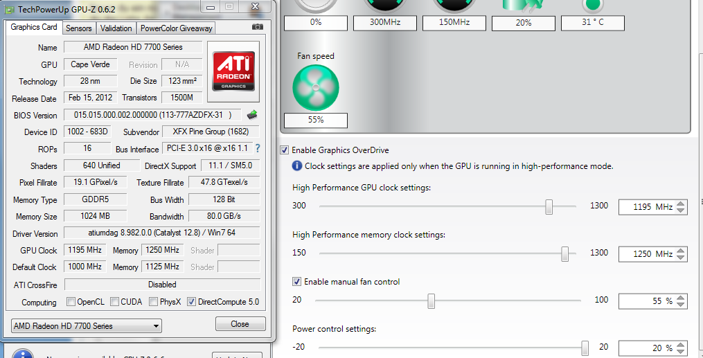 Ich habe ein Problem beim übertakten meiner XFX HD 7770 DD. Ich takte vorsichtig auf 1195 GPU-Takt und 1250 Memory Clock, aber sobald ich mit dem GPU-Takt auf 1200Mhz hoch gehe und die Einstellung mit FurMark testen will, friert sich mein Bildschirm ein und braucht eine Minute bis ich wieder etwas bewegen kann. Danach erscheint in der Notification-Area der Taskleiste eine Nachricht: "Der Grafiktreiber konnte erfolgreich neugestartet werden". Die Temperaturen liegen beim benchen bei 70-73° C, was in meinen Augen noch wirklich akzeptabel ist. Hat jemand eine Idee wieso das passiert?
