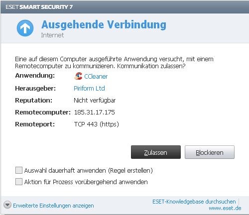Die Version 4.18 stellt beim Aufruf von "C:\Program Files\CCleaner\CCleaner64.exe" oder "C:\Program Files\CCleaner\CCleaner.exe" ungefragt eine Verbindung über Port 443 her.