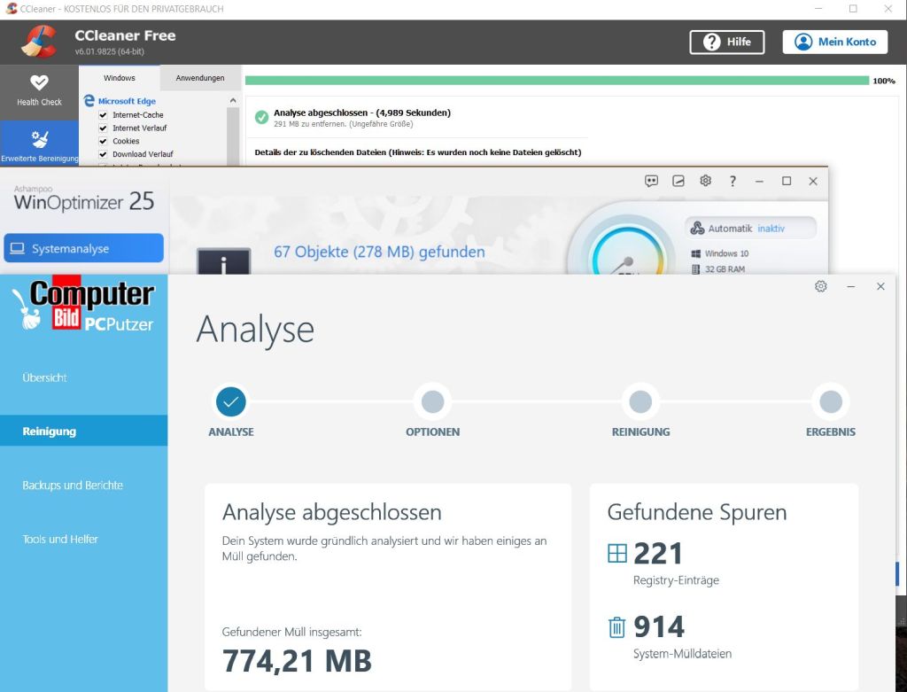 Für die Leute, die den CCleaner hauptsächlich für das Putzen brauchen, habe den Vergleich von 3 verschiedenen Programmen, die nach Müll suchen und ihn löschen: