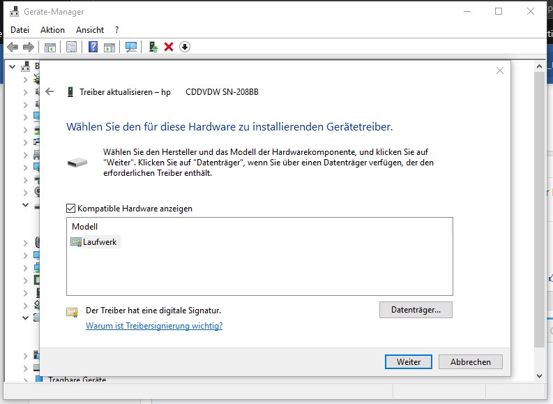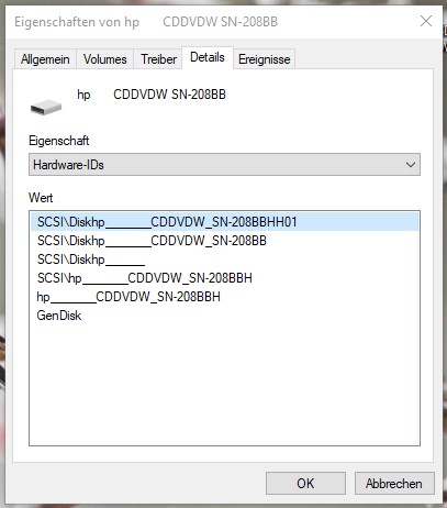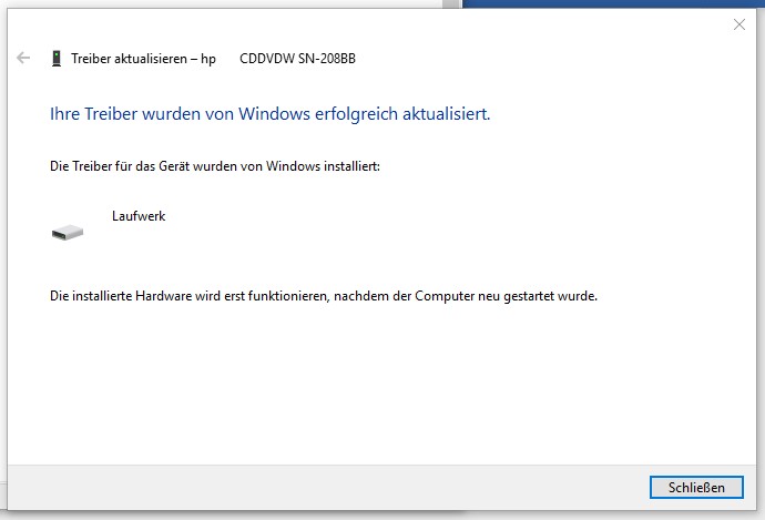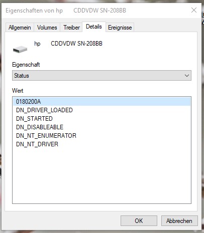Auf der Produktseite von HP habe ich schon nachgeschaut, jedoch gibt es keinen Treiber für dieses Laufwerk. Des Weiteren habe ich die Google Suche bemüht und dort verschiedene Lösungsansätze probiert, jedoch ohne Erfolg. Auch die Treiber die dort angeboten werden bringen nichts. Wenn ich einen passenden gefunden habe und diesen installiere, dann wird mir mitgeteilt das der neueste Treiber schon installiert ist. Ebenso steht in den Eigenschaften des Laufwerks- "Das Gerät funktioniert einwandfrei". Auch eine Deinstallation im Gerätemanager (inkl. Neustart) hat ebenso wenig Erfolg, das Laufwerk funktioniert weiterhin nicht. Meine Vermutung geht nun dahin, das ich ein neues CD/DVD Laufwerk kaufen und einbauen muss.