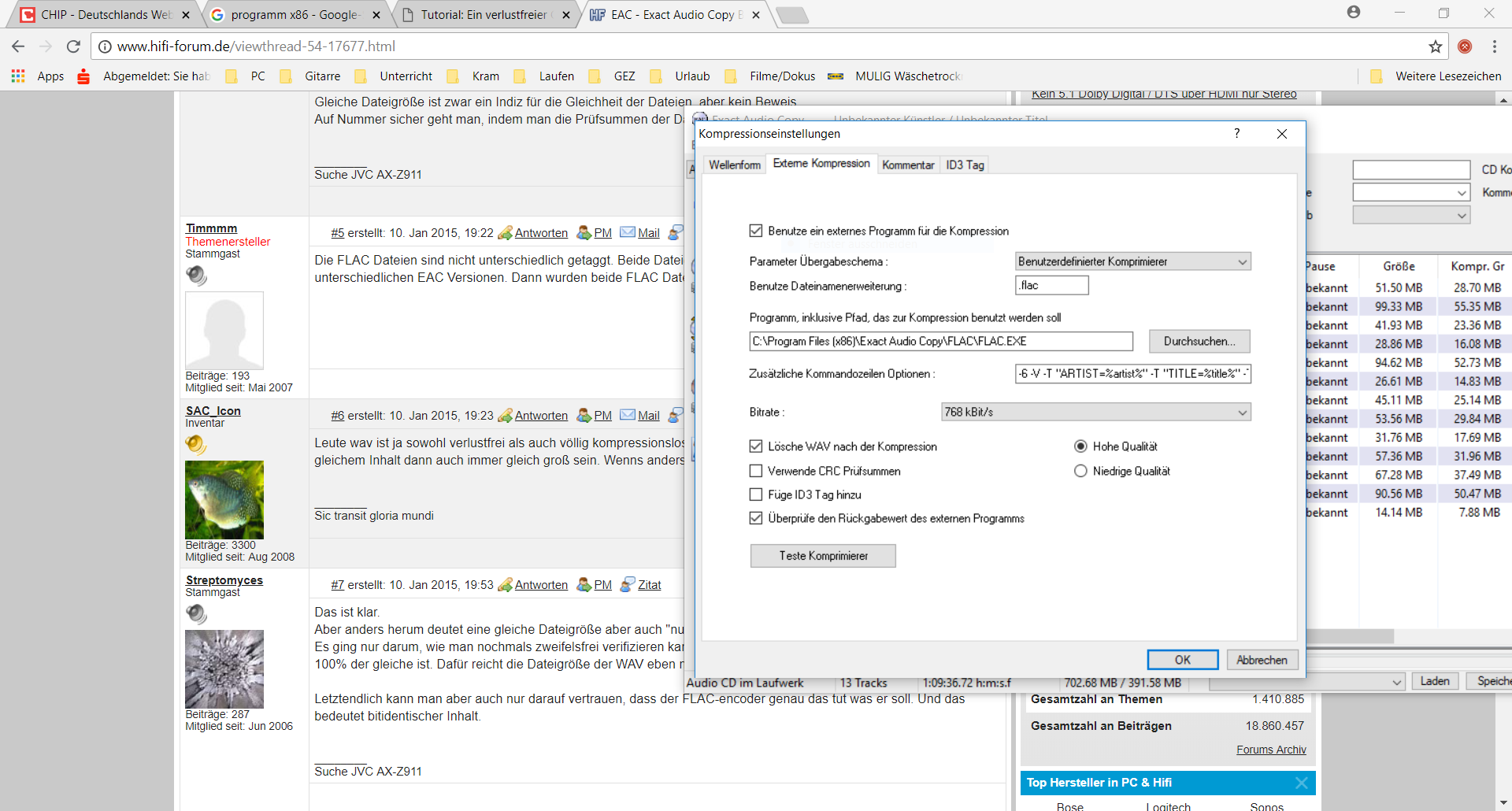 Bei EAC kann man im Übrigen verschiedene Services für Titel und Bild-Erkennung einstellen. Der freie Standard-Service ist besonders bei den Bildern oft nicht besonders gut. Es gibt aber auch einen kostenpflichtigen Service in den Einstellungen, den man für einige Alben erst mal kostenlos ausprobieren kann. Dieser Service (mir fällt der Name gerade nicht ein, sorry) schien mir ziemlich gut zu sein, der hatte immer die richtigen Cover parat und fand auch eigentlich alle dubioseren CDs. Hätte ich nicht schon meine ganze Sammlung archiviert gehabt, hätte ich mir den glatt geholt für ein paar Euro.