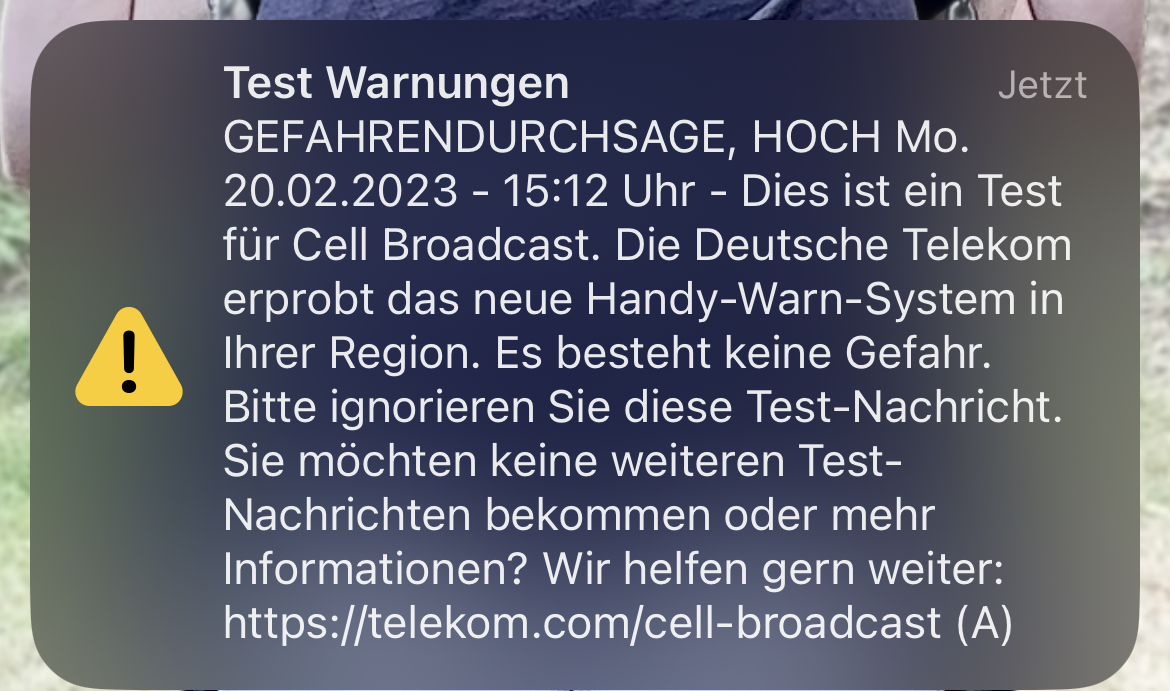 "Entwarnung"? Das ist bei CB nicht vorgesehen. Das verschickt nur eine Art SMS, um zu "entwarnen" müsste eine erneute Nachricht verschickt werden, wo dann "Entwarnung" im Text steht - aber bei einem Test braucht man nicht zu entwarnen, weil ja gar nicht gewarnt wurde.Wilhelm14 schrieb:2012er Nexus 4, Android 7, kann kein LTE, war nur per GSM Vodafone über Klarmobil. Warnung ja, keine Entwarnung.