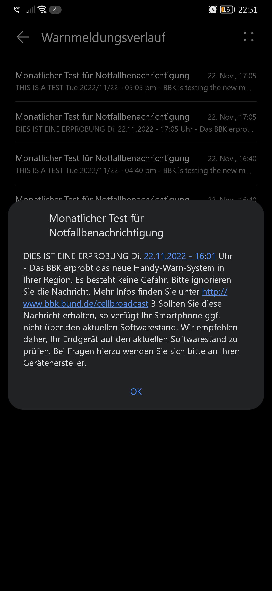 https://www.bbk.bund.de/DE/Warnung-...warnt/Cell-Broadcast/cell-broadcast_node.htmlIn der Testphase ist noch kein vollständiger Wirkbetrieb vorgesehen. Die Einführung des neuen Warnkanals Cell Broadcast ist noch nicht abgeschlossen. Damit der Wirkbetrieb rechtzeitig aufgenommen werden kann, bauen die beteiligten Akteure die notwendigen Anwendungen sowie technischen Einrichtungen für den Einsatz von Cell Broadcast als Warnmittel sukzessive aus. Gleichzeitig werden für den Empfang der Nachrichten ggfs. erforderliche Updates der Smartphone-Betriebssysteme vorgenommen. Alle Beteiligten stimmen die Abläufe systematisch aufeinander ab, optimieren und testen sie intensiv. Der Warnkanal Cell Broadcast wird nach dem Ende der Testphase Ende Februar 2023 für die warnenden Stellen im Modularen Warnsystem des Bundes (MoWaS) freigeschaltet.