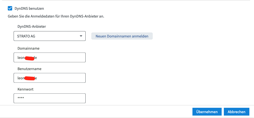 Wenn ich bei meiner Domäne den A-Record auf meine Öffentliche IP setze funktioniert es, dann lässt sich das SSL-Zertifikat installieren und ich komme von außen ganz normal auf meine Cloud. Allerdings funktioniert das natürlich nicht dauerhaft da sich die IP meines Routers nachts wie üblich ändert.