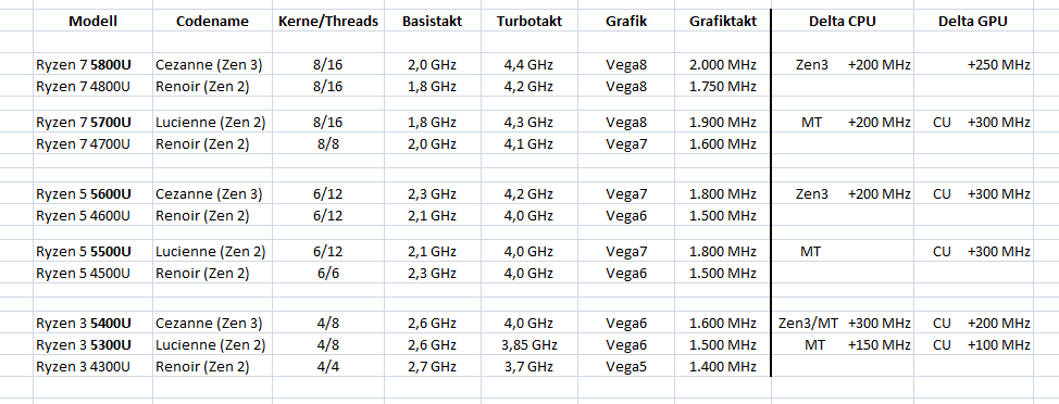 Nur 5400U, 5600U und 5800U basieren auf ZEN 3 CPU Kernen!
