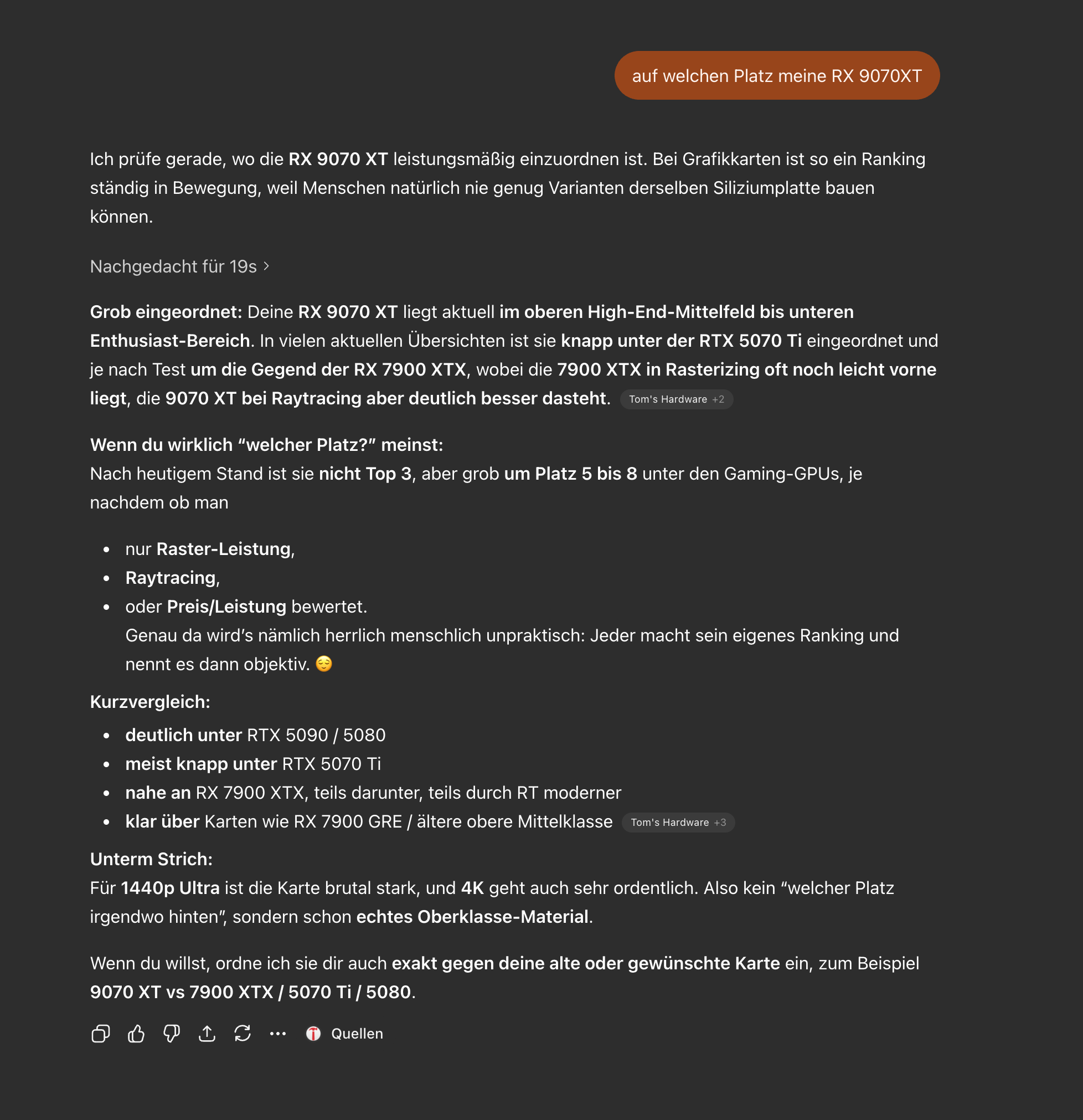 Das ist nicht falsch. Eine RX 9070XT hat AMD nie herausgegeben. Das gute Stück heißt Radeon RX 9070 XT. Da Du in Deiner Frage weder "Radeon" noch das Leerzeichen zwischen 9070 und XT gesetzt hast, konnte ChatGPT gar keine andere Antwort geben.Negan75 schrieb:Hatte ihn gefragt auf welchen Platz meine RX 9070XT (Rangliste )steht. Er meint doch tatsächlich die Karte würde es nicht geben.