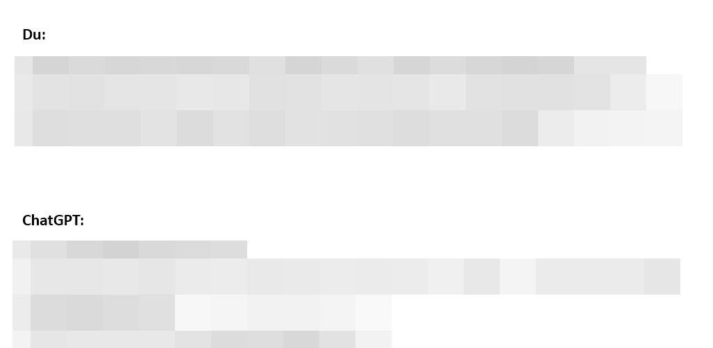 Seit kurzem passiert das aber NICHT mehr. Ich kopiere eine Konversation, kopiere und füge sie ein und es wird einfach nur der gesamte Text übernommen - ohne dass zwischen Antworten von ChatGPT und eigenen Nachrichten unterschieden wird. Es fehlen also "ChatGPT:" und "Du:".
