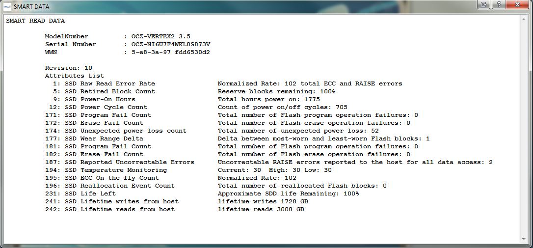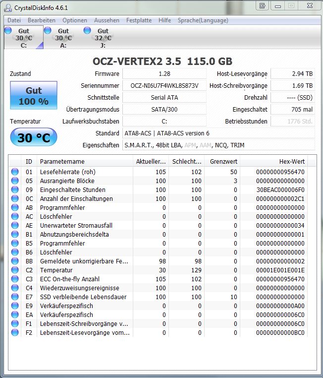 Nach einiger Recherche hier im Forum fand ich heraus das man die Smart Daten der SSD auslesen kann. Das hab ich in Bild 2 getan. Leider kann ich das nicht wirklich deuten.