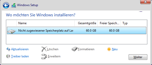 Hier KEINE Partitionen erstellen. Einfach das Laufwerk auswählen und auf weiter. Danach wird Windows installiert und sollte am Ende mit dem Key, der im BIOS hinterlegt ist, aktiviert werden.