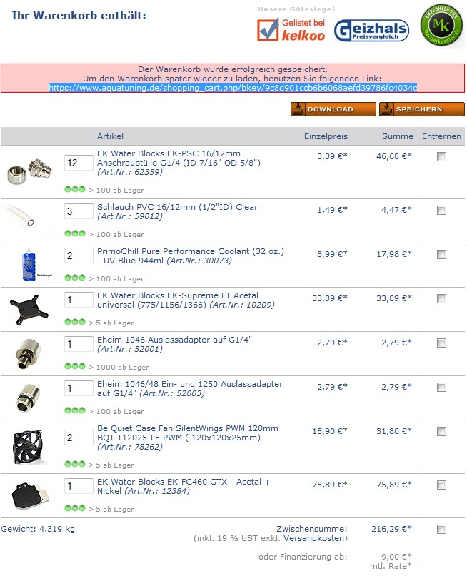 ich möchte mir demnächst den Traum einer eigenen Wasserkühlung erfüllen und brächte dazu mal euren Rat. Mir geht es eigentlich mehr darum, dass ihr mal nachschaut, was ich mir da so ausgesucht habe und mir ein paar Vorschläge, sollte es den welche geben, zur Verbesserung macht.
