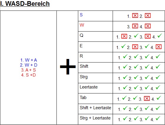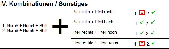 I. WASD-Bereich, II. Pfeiltasten, III. Nummernblock, IV. Kombinationen / Sonstiges