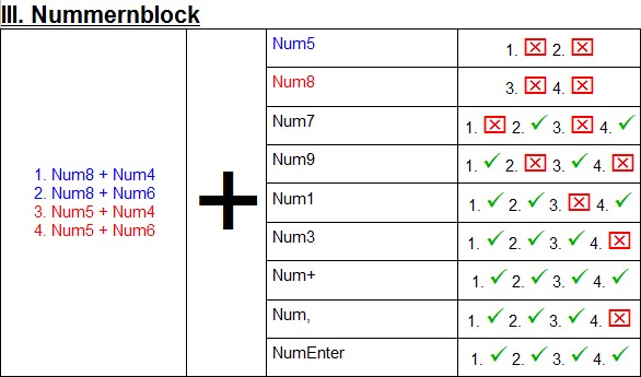 Die Häkchen und Kreuze sind nummeriert, damit man auf einen Blick in Bezug auf die erste Spalte sehen kann, welche Tastenkombination nicht erkannt wird.