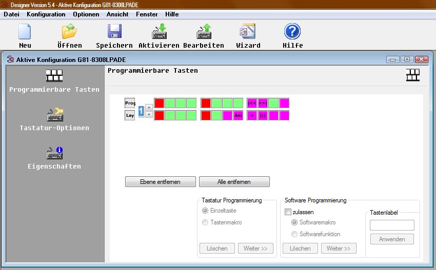 Hierzu bedient man sich zweier Zusatztasten: Einer Layer-Taste, mit der man in Verbindung der F-Tasten eine der zehn Ebenen direkt anwählen kann und die Prog-Taste.