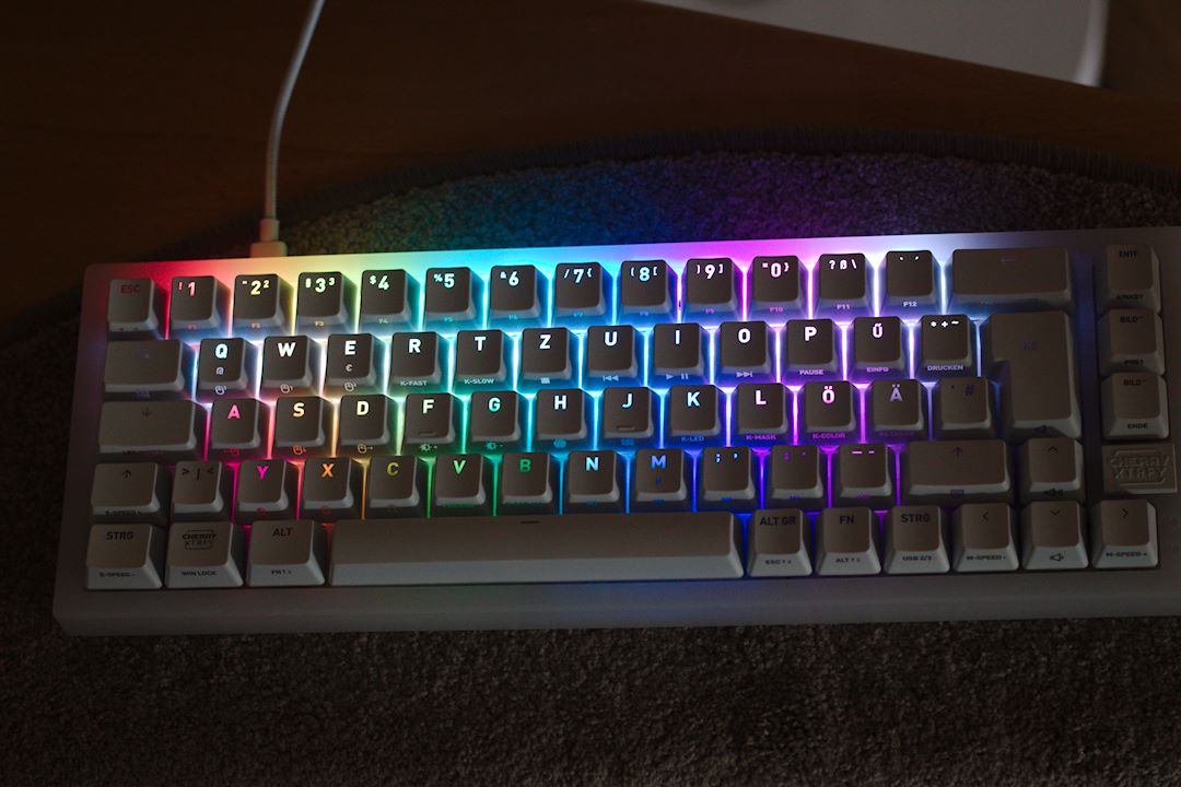 Im Lieferumfang ist ein 200cm langes mit Stoff ummanteltes USB-C auf USB-A Kabel, ein Keycaps puller, 2 Ersatz-Switches, eine Kurzanleitung und ein Aufkleber. Als kleiner Witz liegt ein Cherry XTRFY Magnet Schild bei welches sich über der Pfeil rechts Taste auflegen lässt.