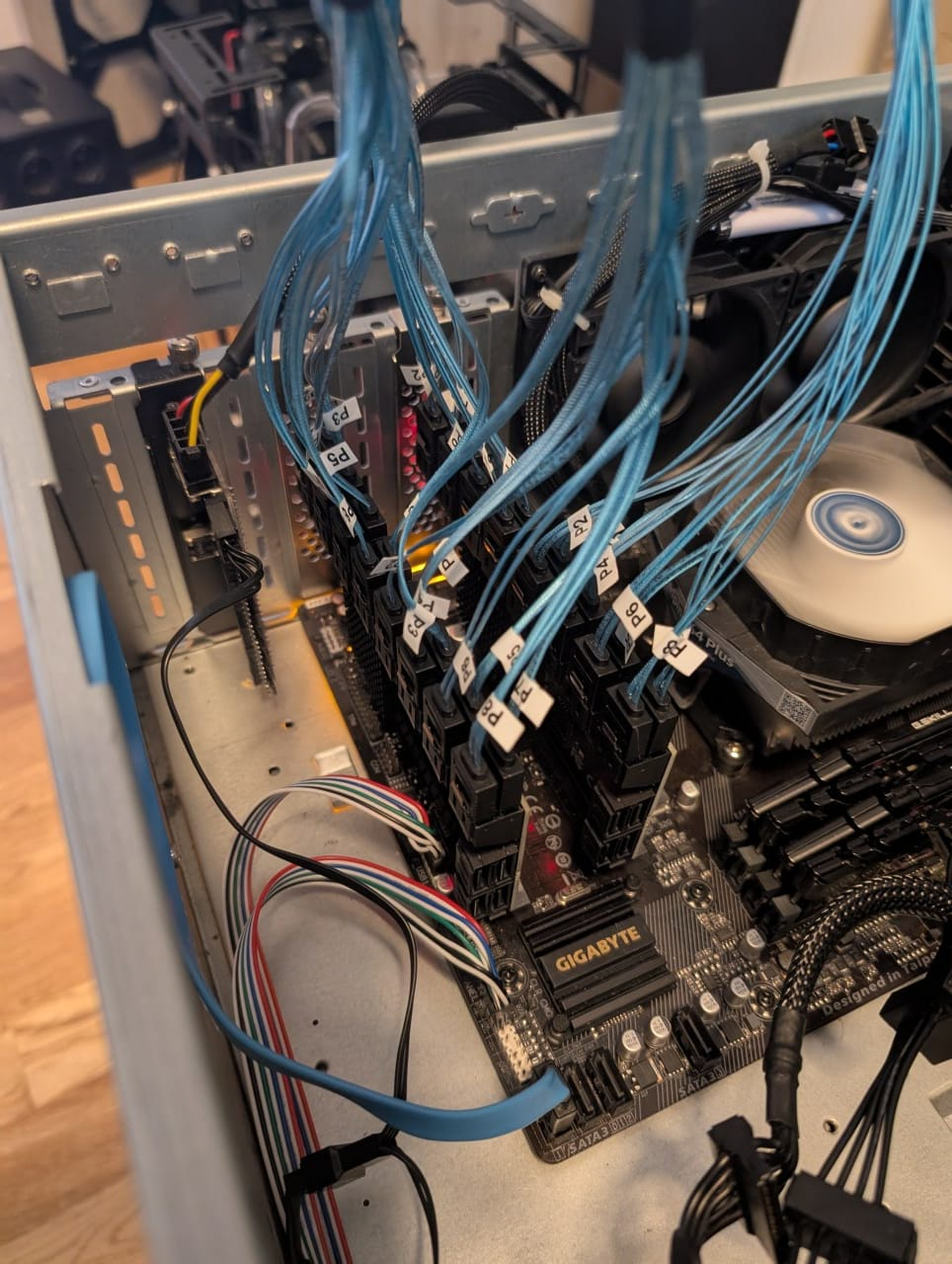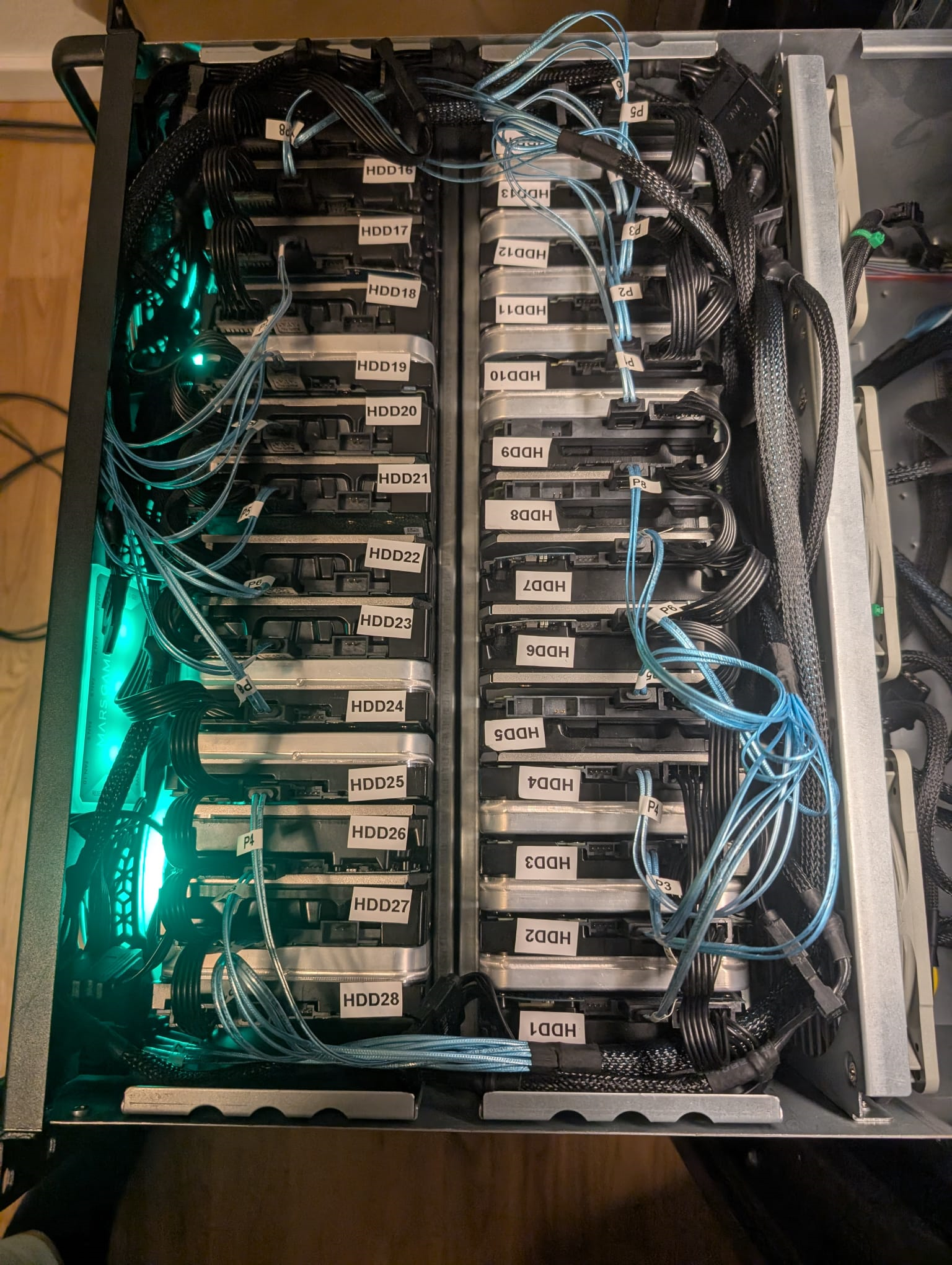 Alle HDD sind via zwei Extension Cards verbunden. Da nutze ich aber nur jeweils 14 der 20 Slots.