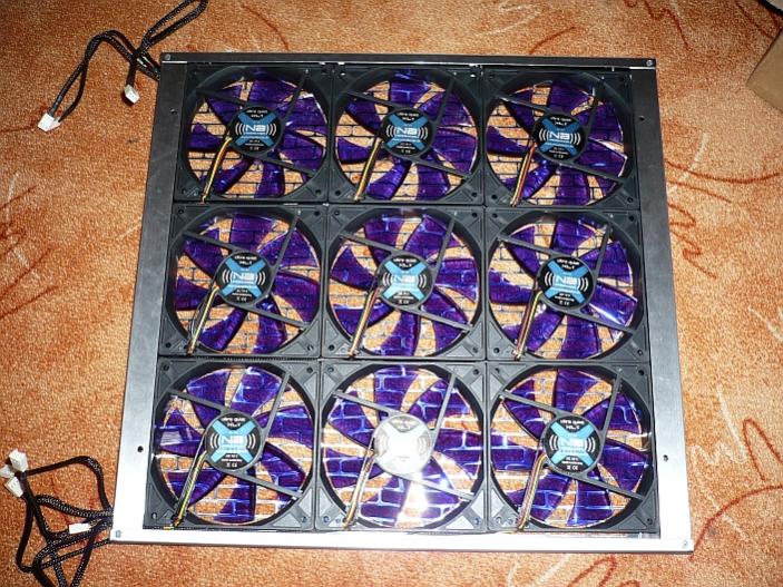 Die Lüfterblende des Mo-Ra2 Radiators - voll bestückt mit 9 Lüftern. Der soll dann das Wasser kühl halten...