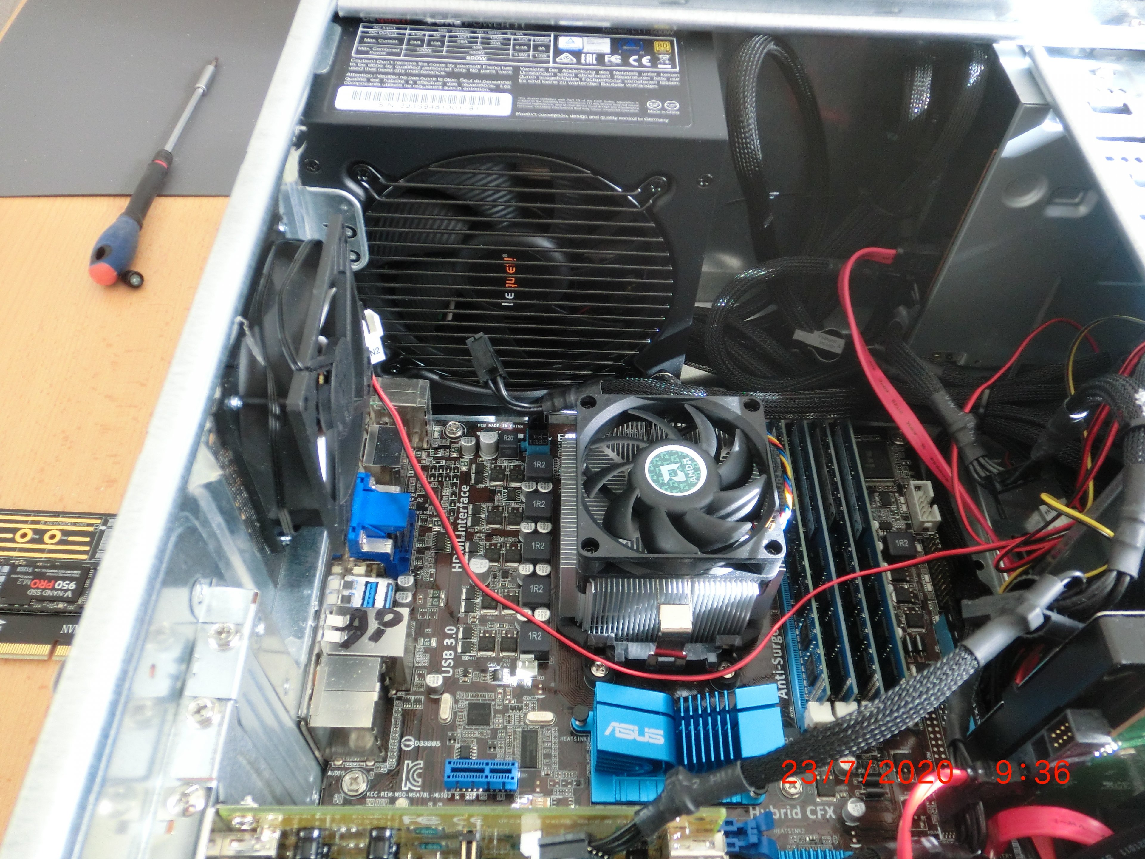 Es war nur die eine SSD auf der Adapterkarte drauf (wie Bilder zeigen) obwohl 3 in 1 darauf möglich sind: 1 NMVE + 2 SATA, also der Stromverbrauch war moderat, nur interne Grafikkarte der AMD-CPU. Mit Aufrüstung war neues be Quiet-Pure Power-Netzteil ins System gekommen 500Watt. Also auch kein unkontrollierter Stromstoß. Auffällig war nur, dass das Netzteil und die Luft im Gehäuse (3 große Lüfter liefen) immer ziemlich warm waren.