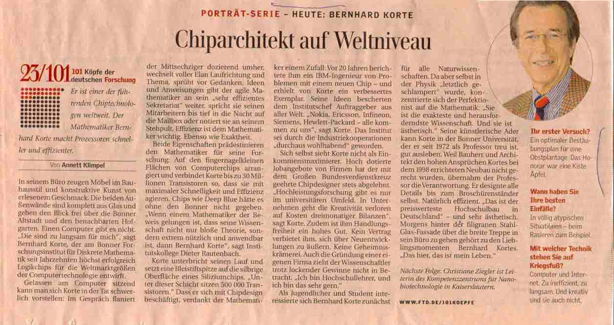 "Berhard Korte - der Chiparchitekt auf Weltniveau weigert sich reich zu werden. (Wohlhabend sein reicht auch). Hochdotierte Industrie-Jobs oder die Gründung der eigenen Firma zwecks Anhäufung eines Vermögens hat er bislang immer abgelehnt. Die Freiheit des Wortes war dem Perfektionisten bislang immer stets wichtiger."