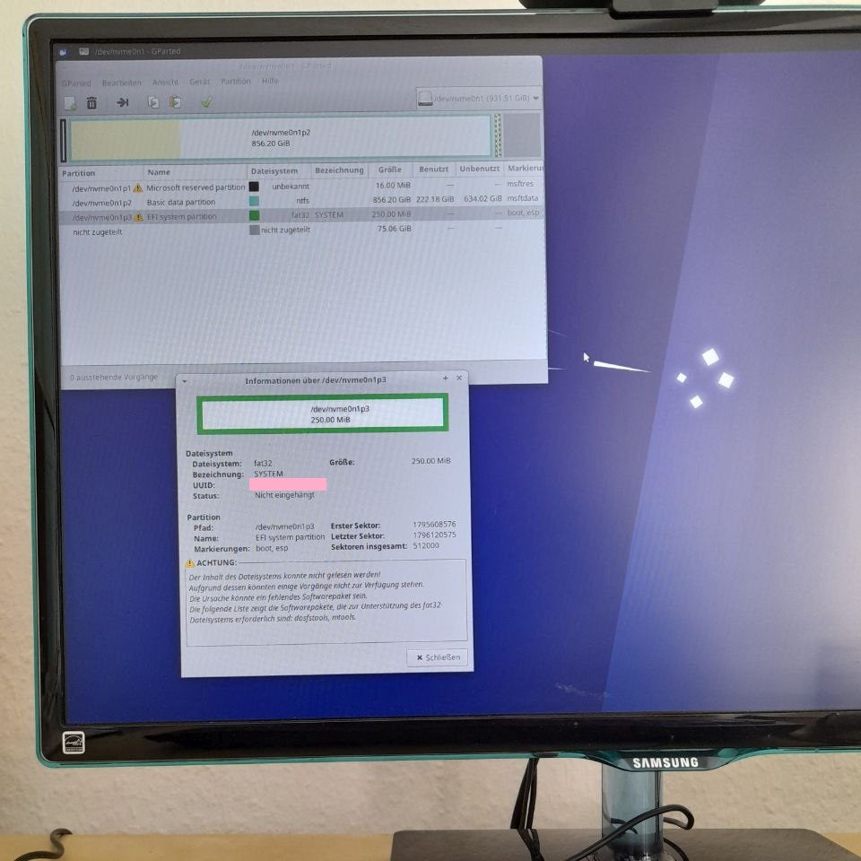 Anmerkung: Ich hab noch nicht mit gparted nachgeschaut, ob dies immer noch meckert.