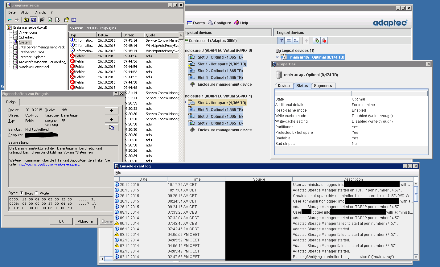 Die mledungen nahmen kein Ende und ich sah mich gezwungen den Server hart auszuschalten da ich das herunterfahren auch nciht mehr abbrechen konnte (Die opberfläche war schon komplett beendet bis auf den Hintergrund und diese Meldungen). Beim neustart konnte ich sehen das der RAID Controller (MegaRAID) offensichtlich kein Problem mit dem Volume hat und Win lief dann automatisch in chkdsk. Dort kamen (und kommen immernoch - es handelt sich um ein 8,7 TB Volume mit mehreren 10 Millionen Dateien) die immergleichen Meldungen vom Typ "Beschädigter Attributeintrag (128, "") wird vom DAtensatzsegment 12345678* gelsöcht".
