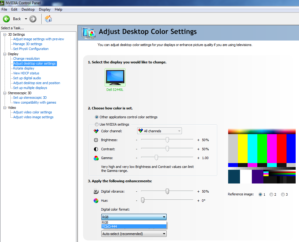 Die eigentliche grundlegende Einstellung befindet sich unter "Auflösung ändern" oder im Bild oben "Change resolution" ganz unten wo man zwischen RGB und YCbCr 4:x:x wählen kann).