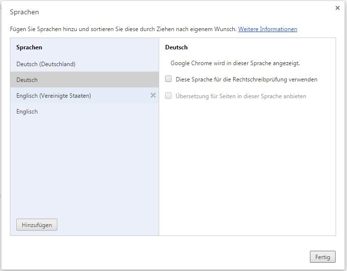 Folgendes Problem: Wie ihr seht ist das Kästchen bei der deutschen Sprache nicht angeklickt (und bei anderen nicht vorhanden) und das Kästchen zum komplett deaktivieren existiert garnicht. Ich habe Version 48.0.2564.82 m, welche wohl die neuste ist, hab es nämlich erst vor na halben Stunde runtergeladen.