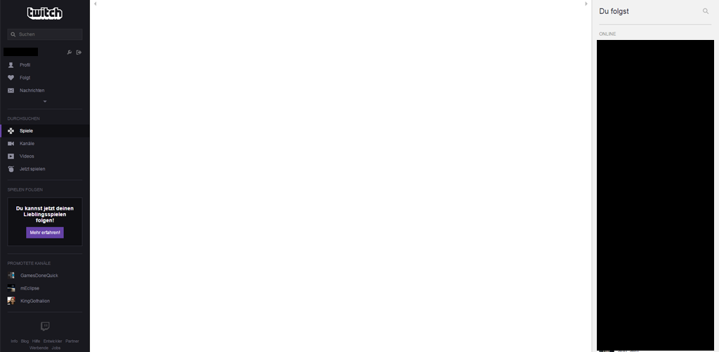 Seit heute wird mir auf Twitch statt der Channelübersicht eines Spieles nur eine weiße Seite angezeigt, jedoch wird mir "Du folgst" weiterhin angezeigt und ich kann auch Channel aufrufen und ansehen, sofern ich die URL kenne und diese manuell eintippe.