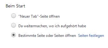 Gehe mal in die Chrome Einstellungen und dort wie auf dem Bild in die Option "Beim Start". Dort kannst Du festlegen welche Seite beim Start angezeigt werden soll. Dann müsste das Problem gelöst sein.