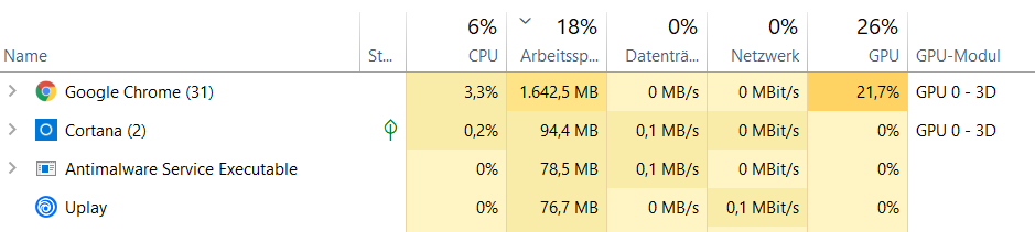 mir ist beim Streamen aufgefallen, dass es zwischendrin immer mal wieder laggt und dank dem Taskmanager habe ich das Problem identifiziert. Ich habe eine 2080 ti und Chrome verbrauch um Schnitt 22% der Power. Alle meine Task sind Seiten wie CB. Kein Rendering oder sonst was. Und eigentlich auch minimiert.