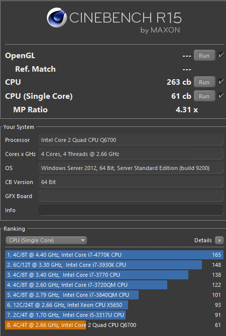ich glaube dir, dass du das wirklich so gemessen hast. aber 6,7x schneller kann nicht stimmen. der gesamtwert scheint realistisch zu sein im vergleich zu anderen messungen. aber single nur 41, da passt was nicht. der basiert auf nehalem vermute ich mal (kenne mich mit xeon nicht so aus). also müsste der vergleichbar sein mit eine i5-750. der hat aber fast 100 punkte im single. ja, der turbo ist beim i5 etwas höher, dass macht aber nicht 100% mehr leistung aus. ich vermute dein system kommt mit der singlecore last nicht klar. vllt takten die kerne gar nicht hoch. vom amds 6kerner kenne ich das problem, last auf einem kern (sind ja nur 16% gesamtlast) lassen den stumpf im untersten p-state verweilen. bei intel erlebe ich das aber zum ersten mal.Laut Ark geht der Turbo auf 2,8Ghz.