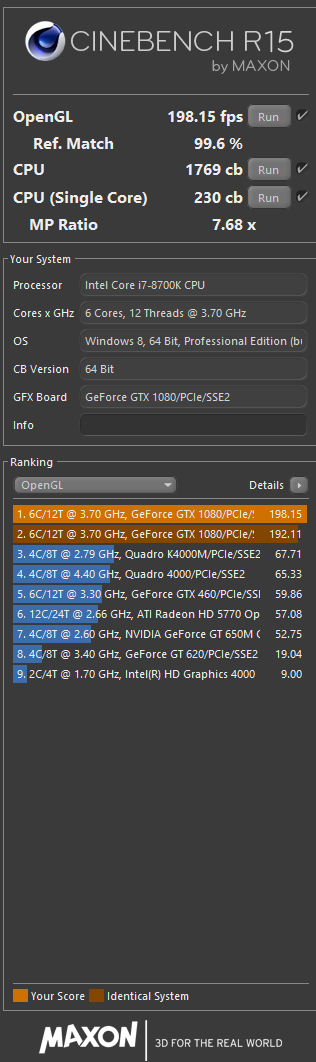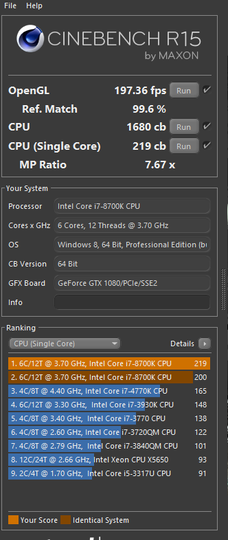 @Martin: Dein Score erscheint mir recht niedrig. Habe mit 4.2Ghz ca. 1250 und mit 4.5Ghz min. 1331 erreicht. Ist die Vcore Stable?