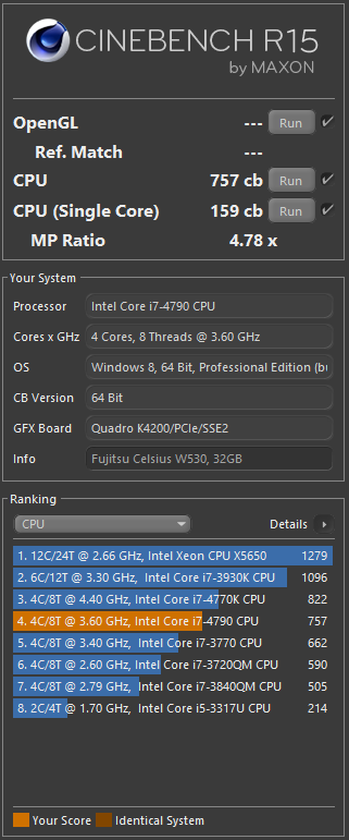 Stock: Xeon E5450 (4/4 @ 3,0); single: 85; multi: 324