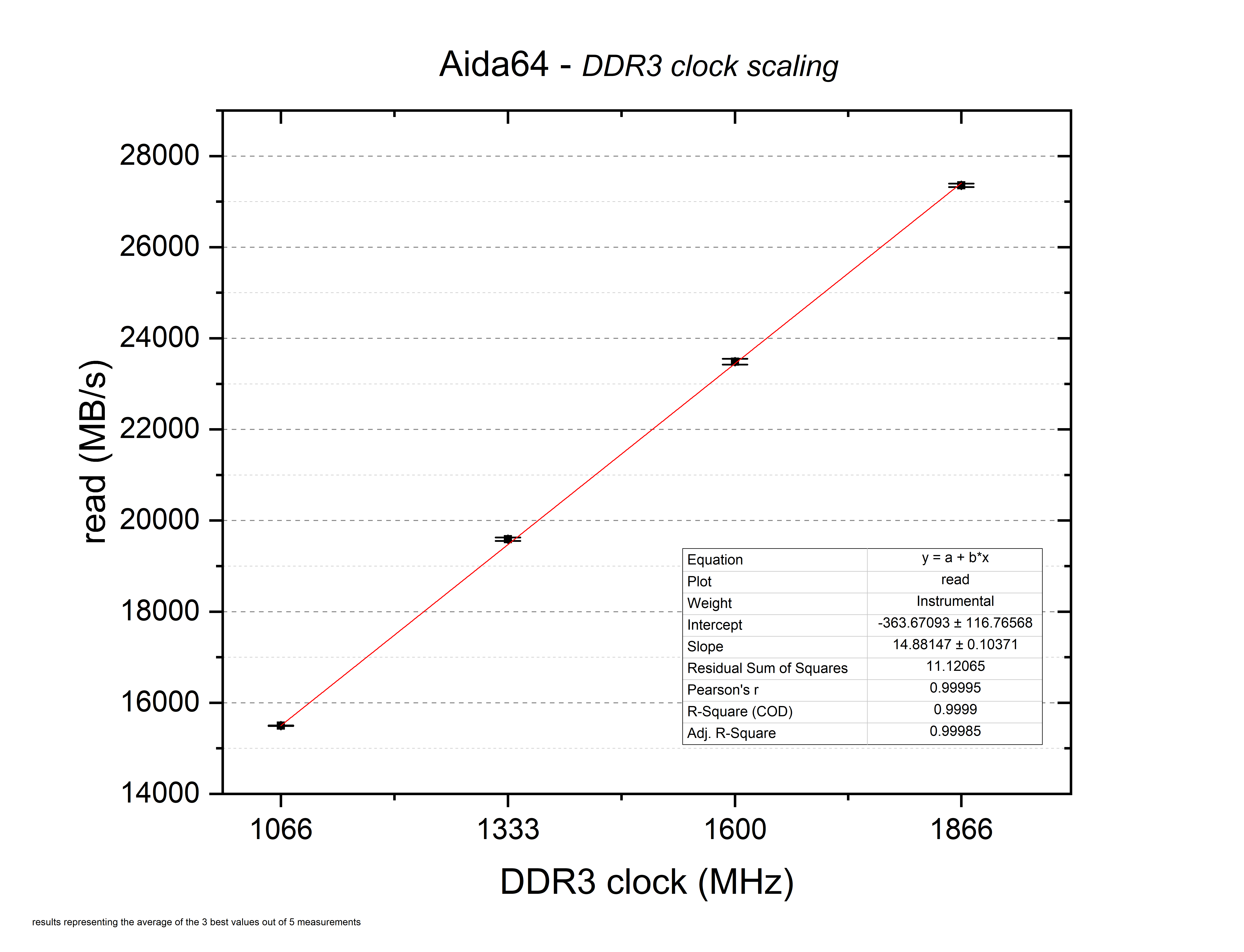 Wie man sieht, sehen wir einen perfekt linearen Zusammenhang für DDR3 Ram, wobei jedes MHz effektiver Ram Takt mehr, uns 14,88MB/s mehr Leserate bringt.