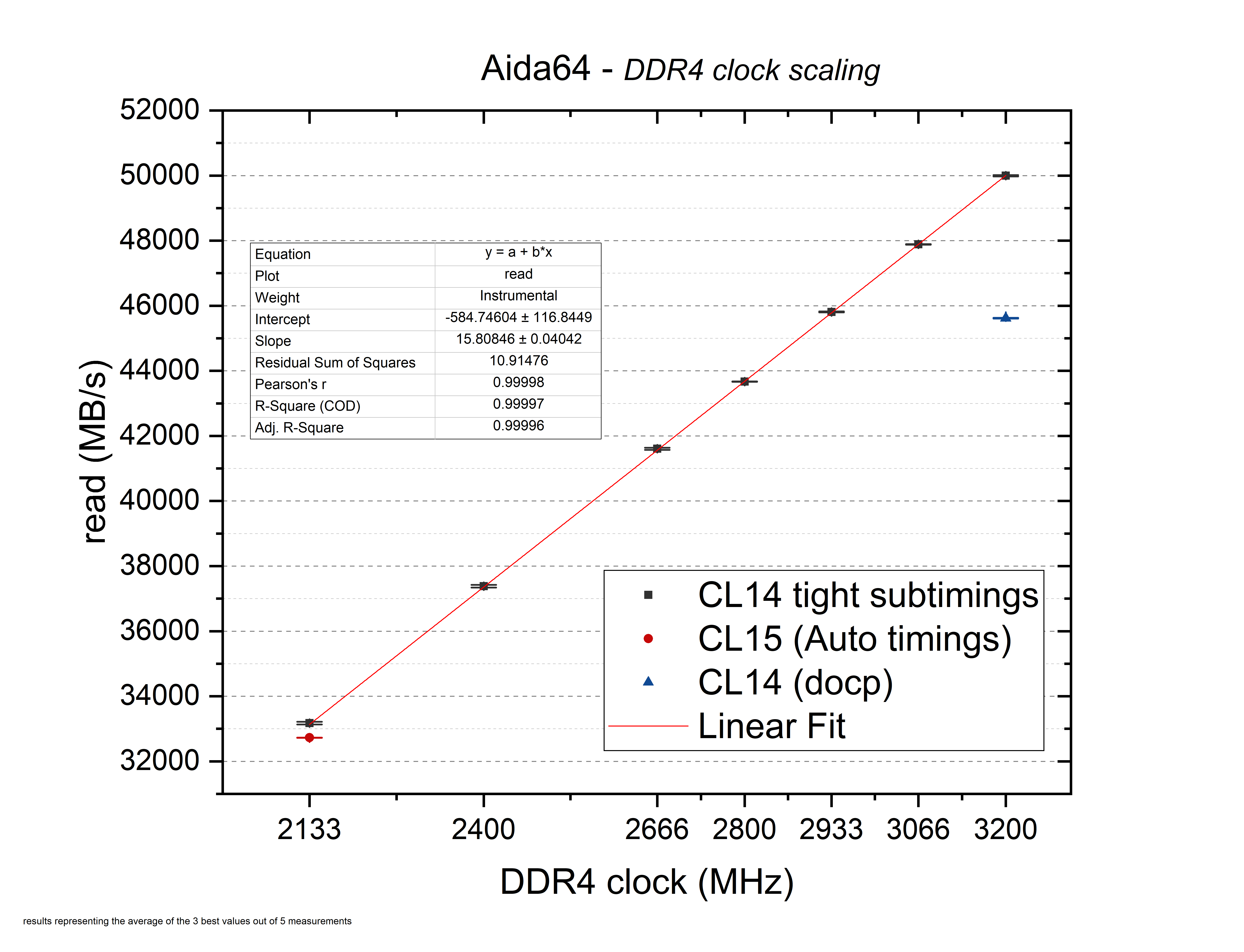 Die Werte für 2133 CL15 und das 3200 er docp Profil habe ich mit eingetragen, sie fließen aber nicht in den linearen Fit ein.