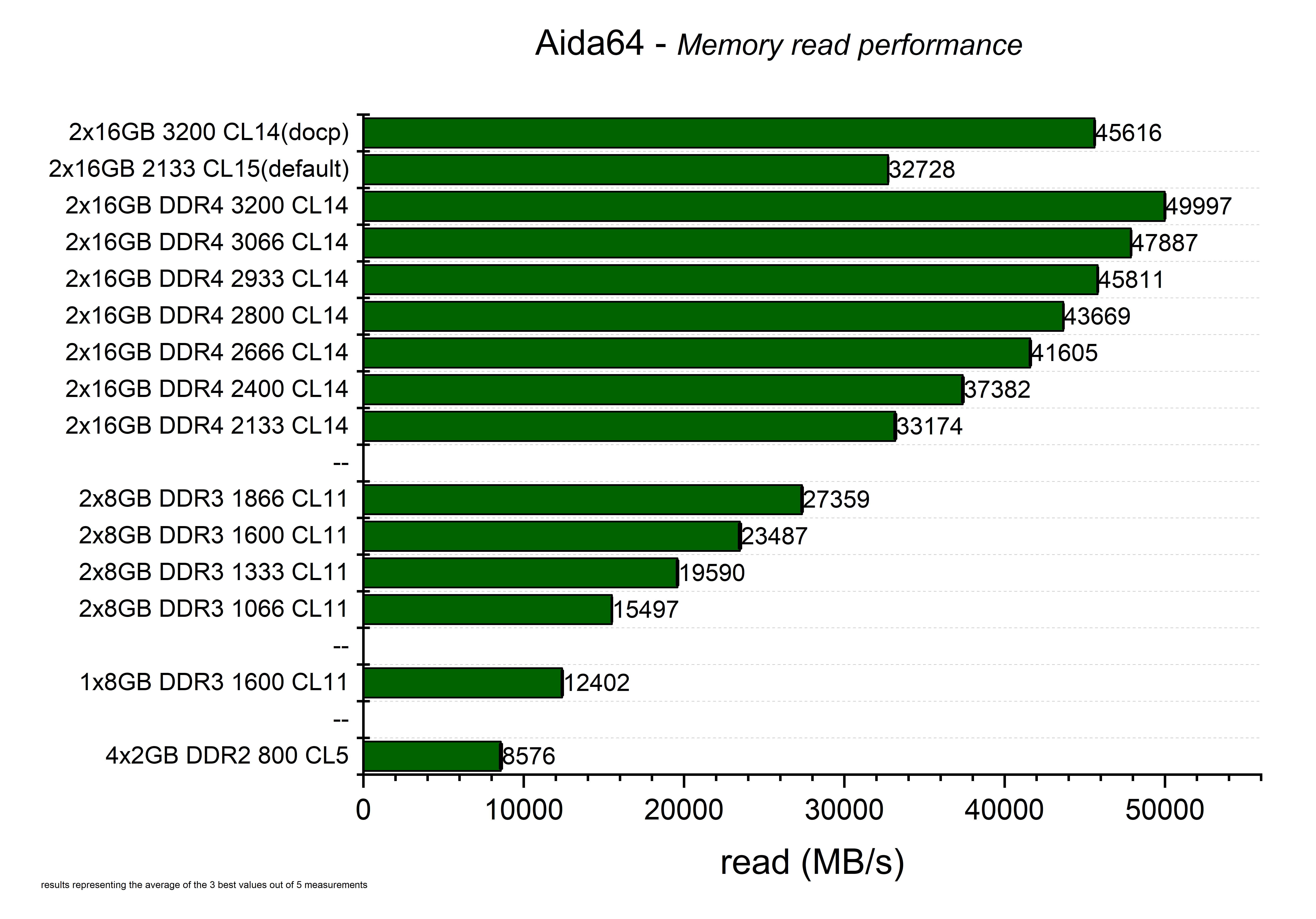 Bei DDR4 habe ich zusätzlich den Basiswert nach einem Bios reset von 2133 CL15 sowie die Ergebnisse des hinterlegten Ram Profils für 3200 CL14 getestet.