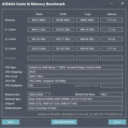 Um die Ram Geschwindigkeit zu testen, nutze ich den Cache & Memory Benchmark von Aida64. Ich habe mich auf die Read Werte konzentriert, da ich denke, dass diese für Frametimeverläufe in Spielen am wichtigsten sind.