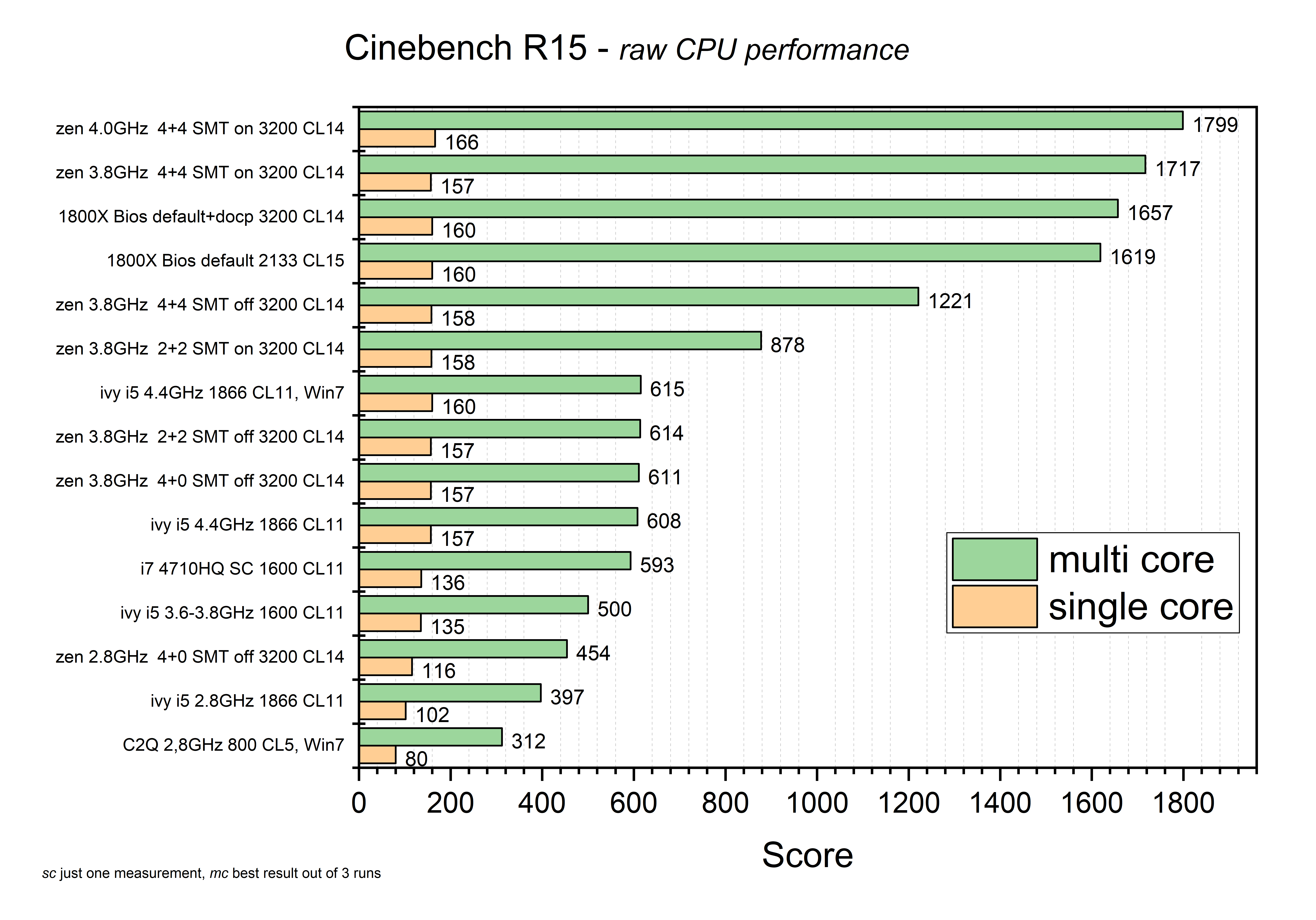 So zeigt sich, dass das normale Boost Verhalten des 1800X von 3,7GHz allcore zu 4,1GHz bei 1-2 benutzten Kernen, zwar eine leichte SC Steigerung gegenüber festen 3,8GHz bietet.
