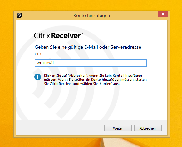 Wir haben neue Lenovo T440s mit Windos 8 und wollen darauf den Citrix reciever zum laufen bringen. Wenn sich das ganze installiert hat, soll man einen Server Adresse oder E-Mail eingeben. Die Adresse vom alten client (win 7) funktioniert aber nicht. Es kommt die Meldung: "Ihr Konto konnte nicht mit dieser Serveradresse hinzugefügt werden. Prüfen Sie die Eingabe. Sie müssen ggf. eine E-Mail Adresse eingebn."