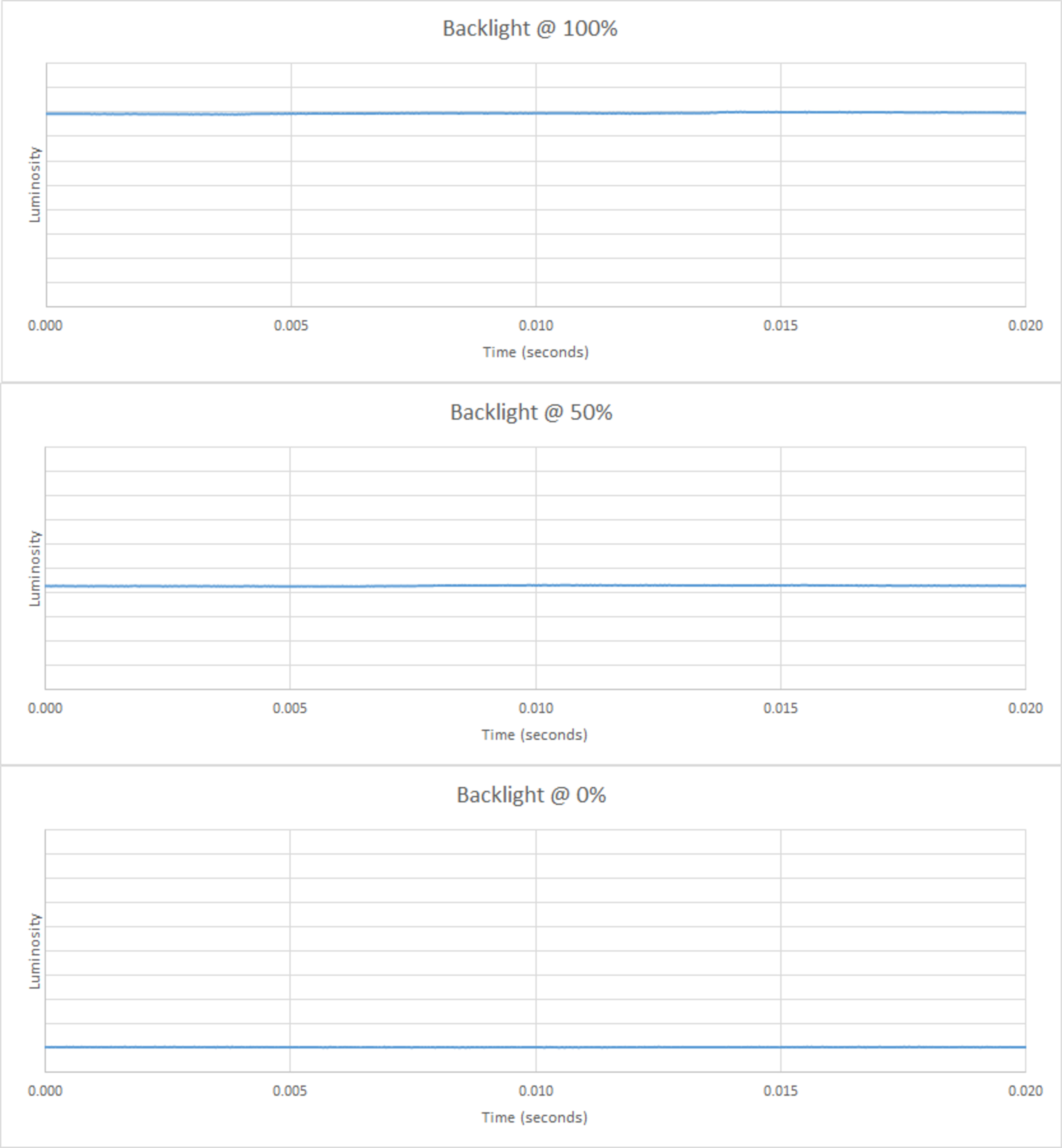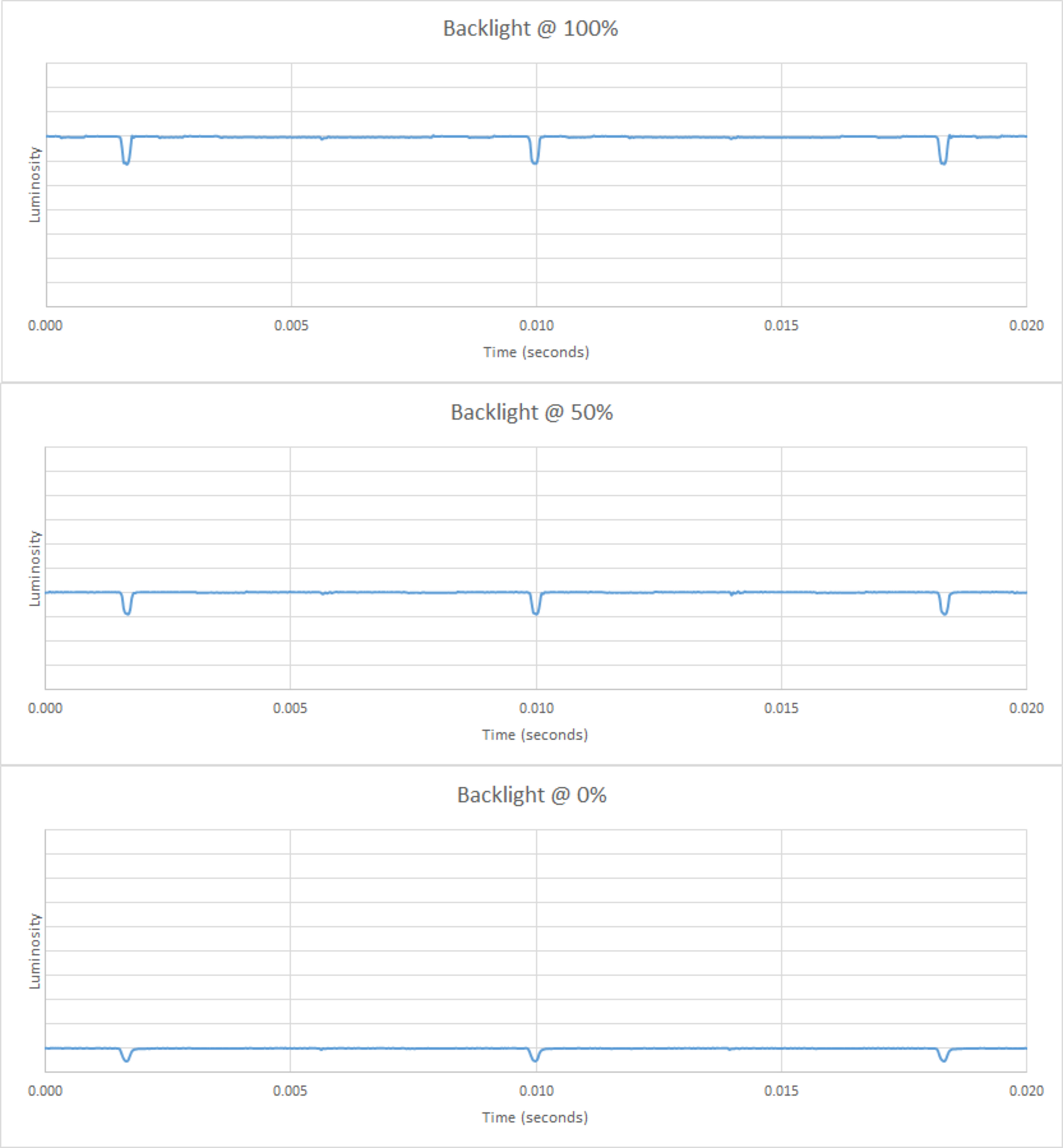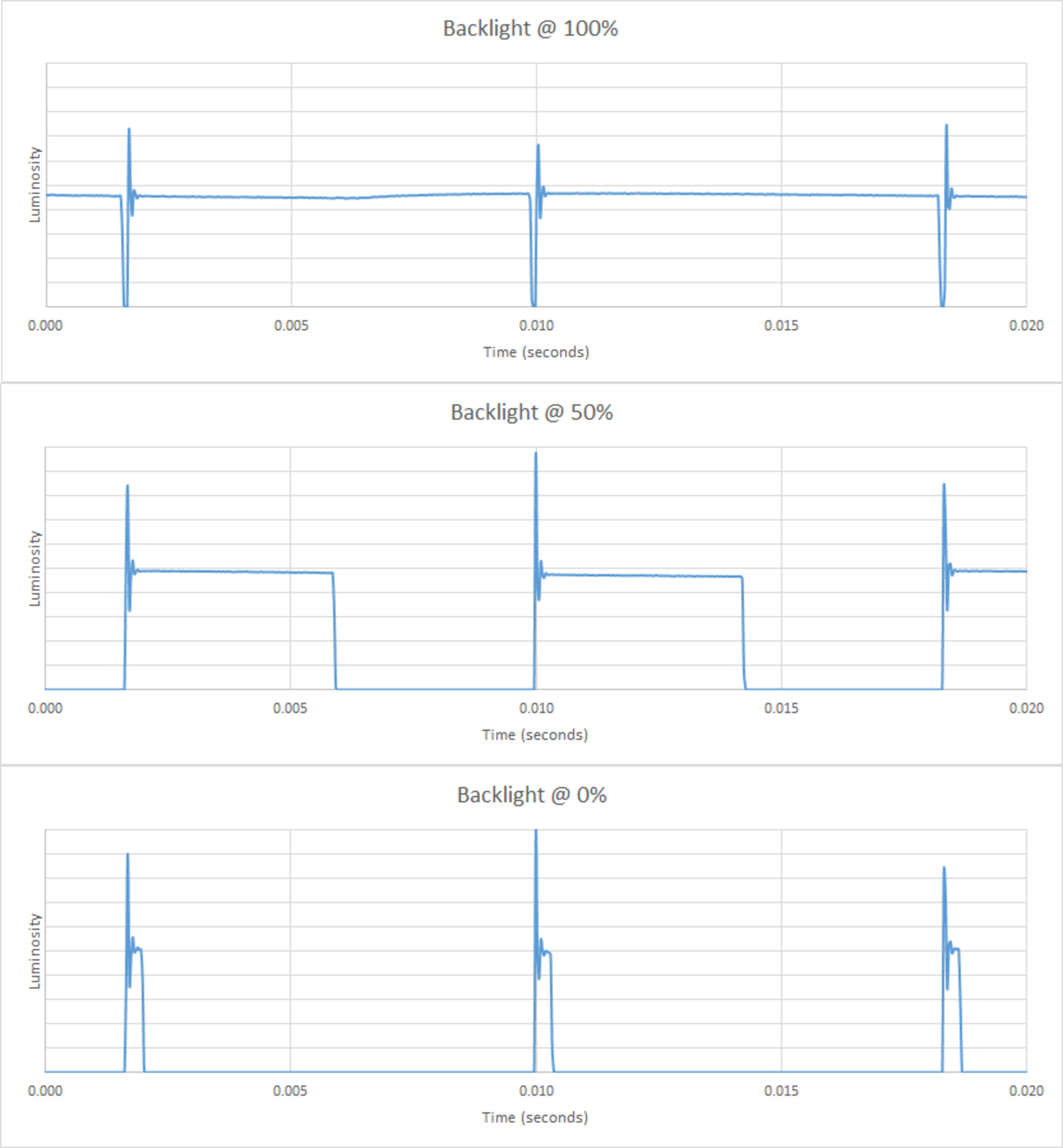 Wie man sieht ist die Helligkeit konstant mit einem minimalem Einbruch beim Bildwechsel. Das ist aber kein herkömmliches PWM. OLED-TVs gelten als flicker free. Dieser minimale Einbruch ist nicht wahrnehmbar.