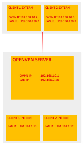 Wie auf dem Bild zu sehen ist, habe ich einen Open VPN Server laufen, auf den die externen Clients per OpenVPN zugreifen können.