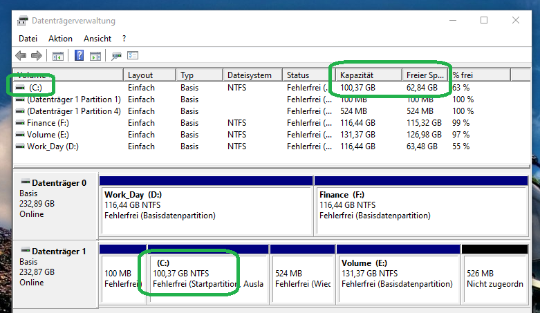 Bitte einen Screenshot der originalen 118 GB, und der neuen 250 GB SSD, mit den grün eingerahmten Daten.