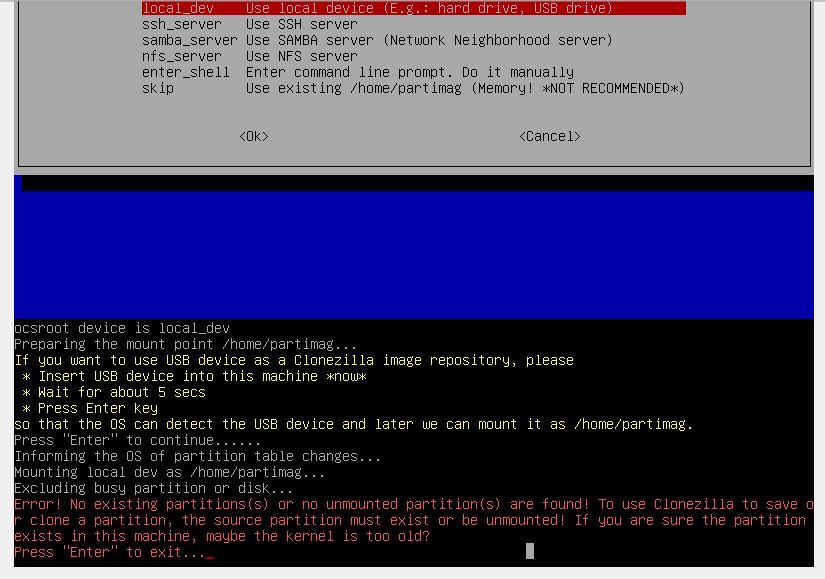 Die Fehlermeldung rührt daher, dass Clonezilla deinen USB-Speicher nicht erkennt oder nicht lesen kann.