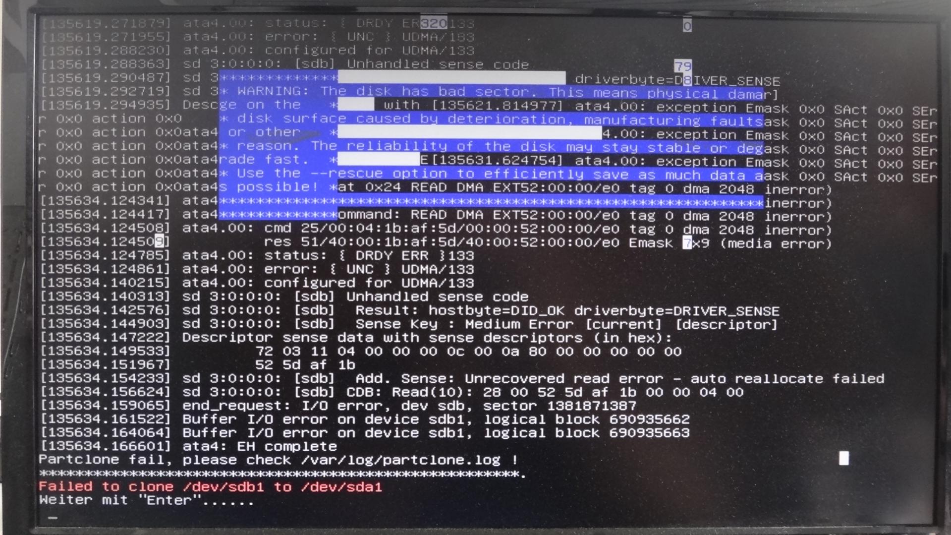 wollte mit Clonezilla eine 1,5 TB Festplatte klonen. Nach 2 Tagen kam diese Fehlermeldung.