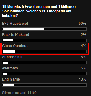 Was ist denn mit den Leuten bei EA los?! Ich meine wir reden von EA, OMG! Ich glaube die haben angefangen zu kiffen, sonst wollen die doch schon Geld dafür haben damit man alle Inhalte (Tarnungen etc) nutzen kann. Gute PR ist das trotzdem ^^ Was hätte EA wohl gemacht wenn alle DLC's in der Umfrage den selben Beliebtheitsgrad hätten?