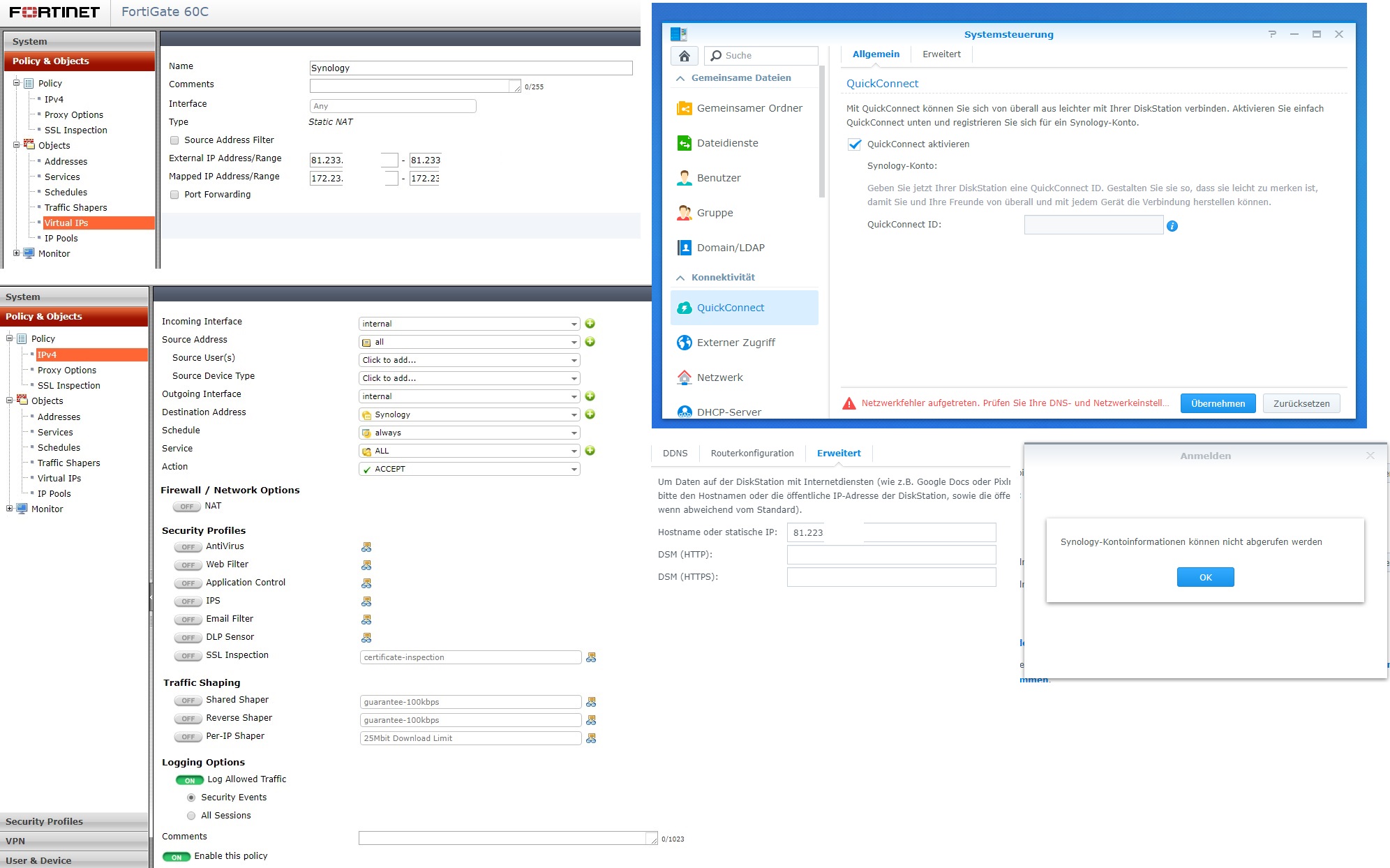 QuickConnect wollt ich meiden weil dann der Datenverkehr über einen Synologyserver geht, aber auch das wollte ich heute versuchen und wenn ich QuickConnect aktiviere kommt Fehler „Netzwerkfehler aufgetreten. Prüfen Sie ihren DNS-und Netzwerkeinstellungen (siehe Screenshot).