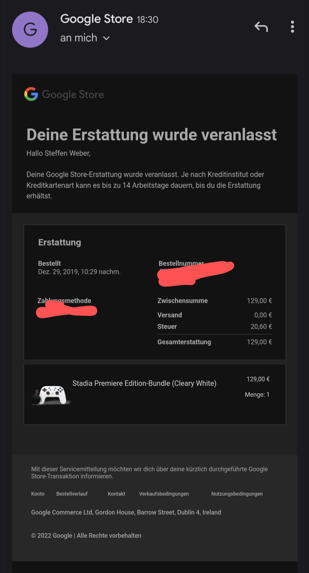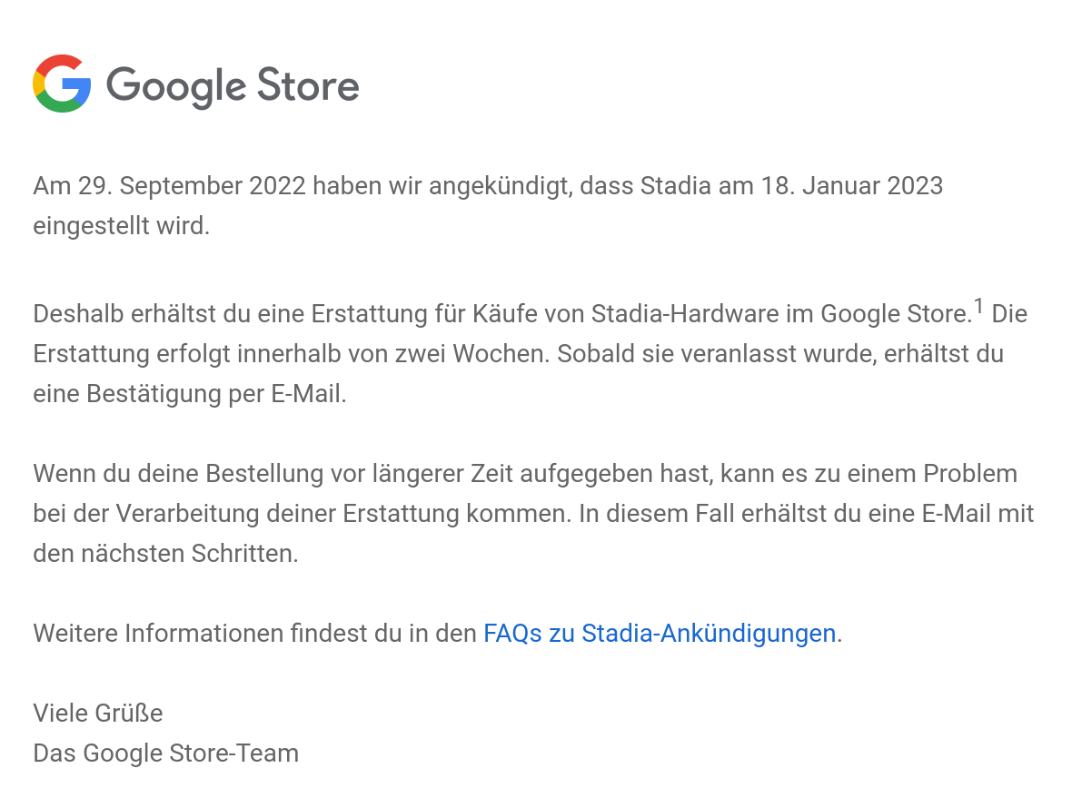 Meine Erstattung soll in den nächsten 14 Tagen kommen. Hatte die Stadia Premiere Edition im Google Store gekauft (aber keinerlei Software).