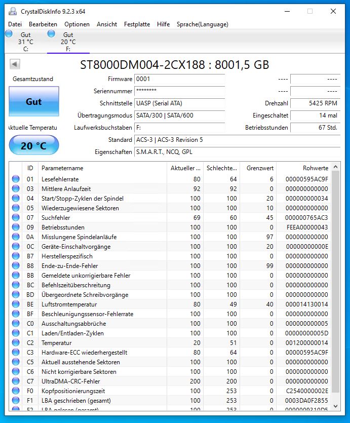 In der NAS: 3x3TB(Toshiba P300) sowie 1x2TB(Seagate schlagmichtod) und eine 3TB Parität. Insgesammt 5 HDDs.